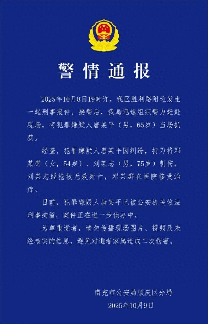 央视网消息:据顺庆公安微信公众号消息,10月9日,四川南充市公安局顺庆区分局发布警情通报:2025年10月8日19时许,我区胜利路附近发生一起刑事案件。接警后策利配资,我局迅速组织警力赶赴现场策利配资,将犯罪嫌疑人唐某平(男策利配资,65岁)当场抓获。经查策利配资,犯罪嫌疑人唐某平因纠纷,持刀将邓某群(女,54岁)、刘某志(男,75岁)刺伤。刘某志经抢救无效死亡,邓某群在医院接受治疗。目前,犯罪嫌疑人唐某平已被公安机关依法刑事拘留,案件正在进一步侦办中。为尊重逝者,请勿传播现场图片、视频及未经核实的信息,避免对逝者家属造成二次伤害。