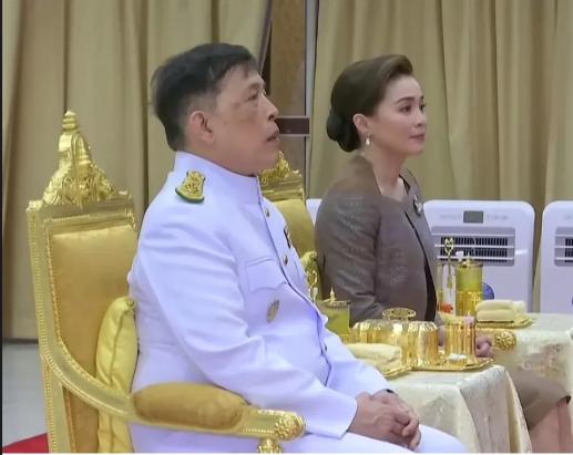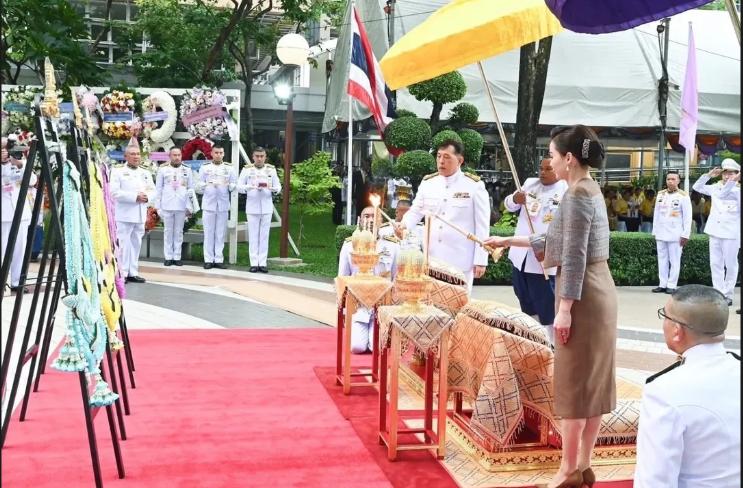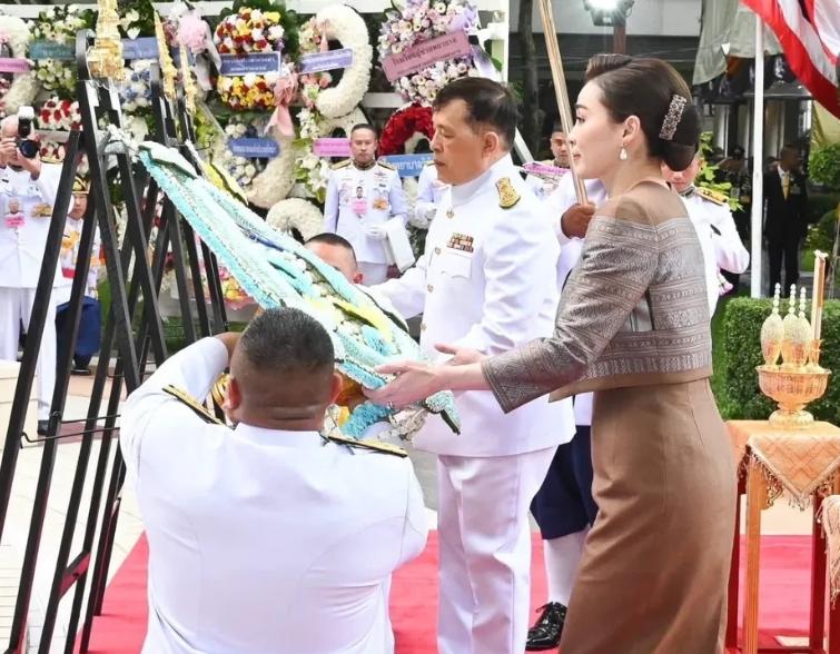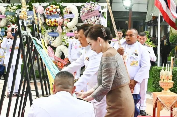 玛哈国王身穿白色宫廷融合组昂,面对爷爷的雕像叩首,然后摆放了花圈,焚香烛,随后苏提达王后也赶快上前,献上了花环。
