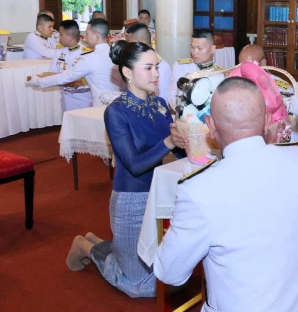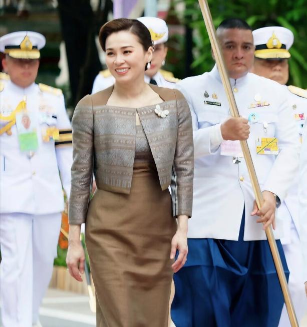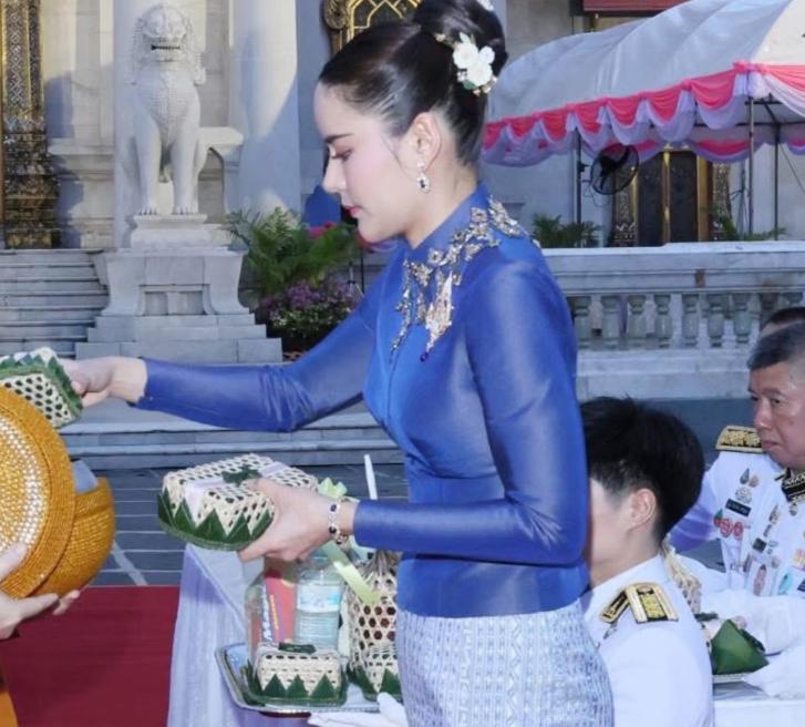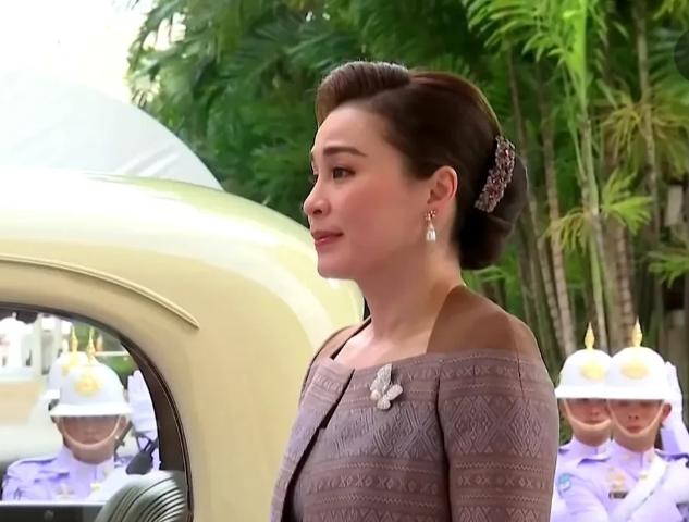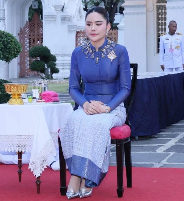 在整个流程活动中,泰王与苏提达王后都是非常肃静的,王后在造型打扮方面也都是低调婉约,端庄大方,珠宝首饰只有胸针和珍珠耳环。苏提达非常拎得清,给国王爷爷敬献花环不能失礼。