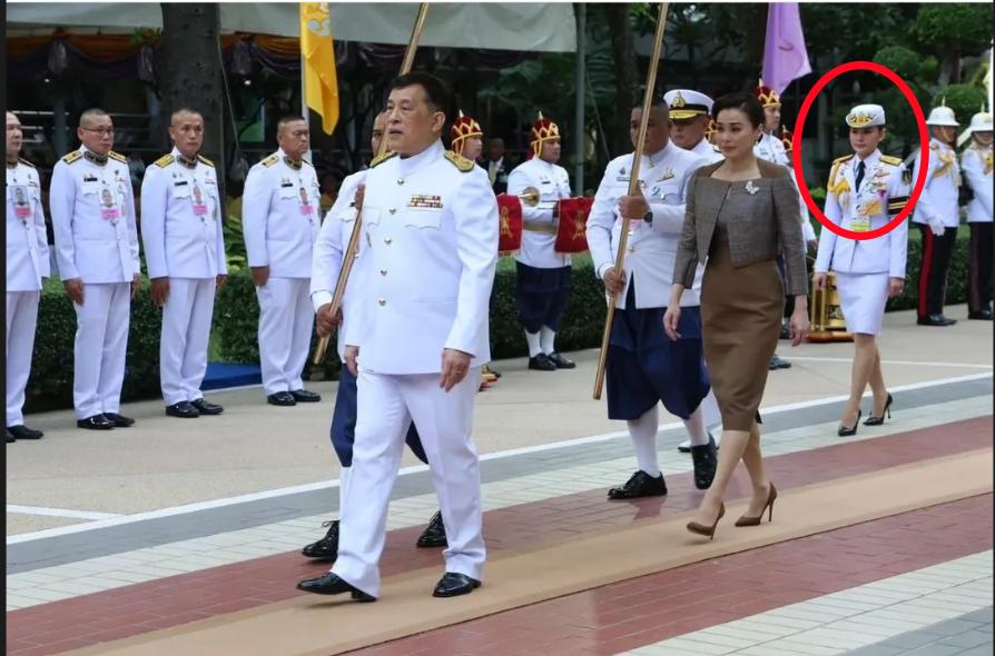 欧拉弄小主身穿白色宫廷制服装,自信张扬地走在国王夫妇身后。近来泰王夫妇的公务活动,她全都跟着,看来整容后的她恩宠依旧,并且地位非常稳固。